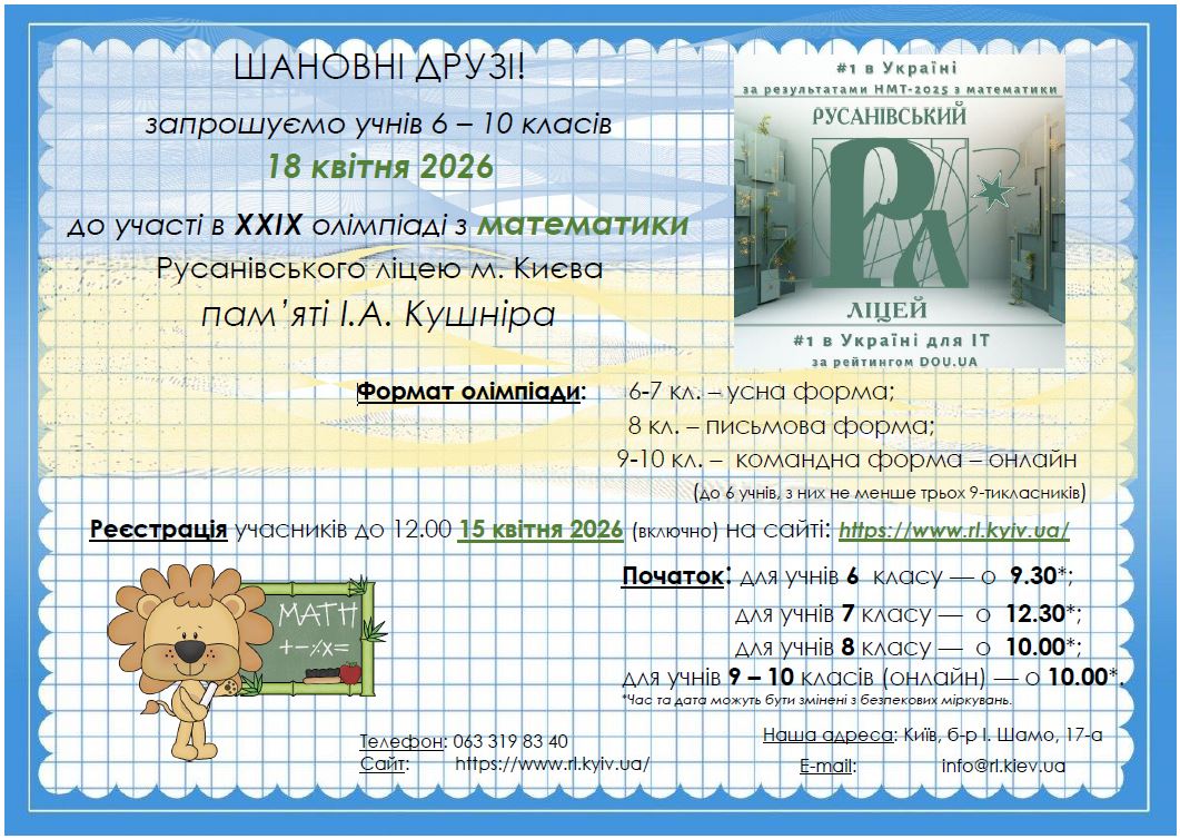 Запрошення на ХXІX олімпіаду з математики Русанівського ліцею пам’яті І.А.КУШНІРА